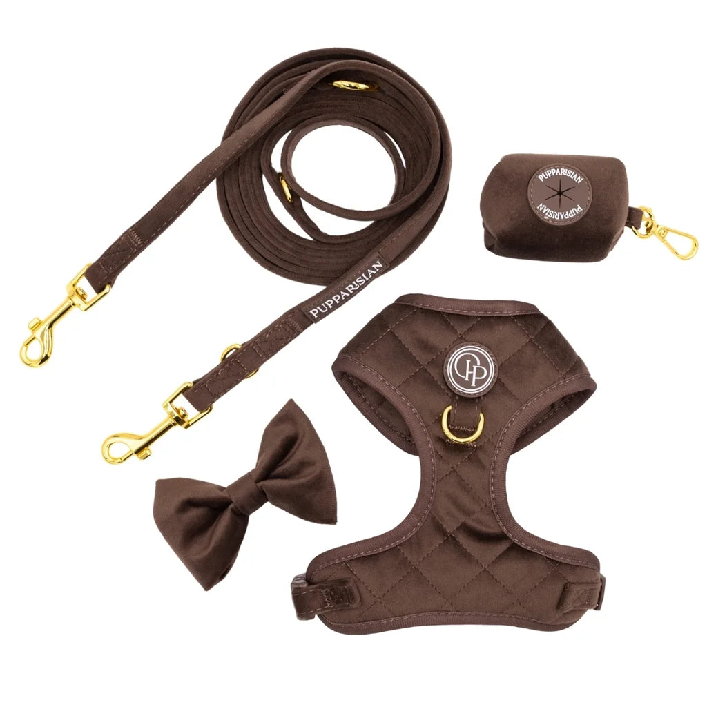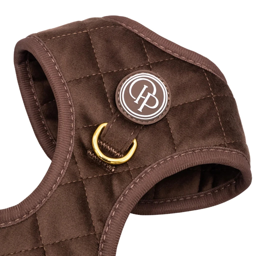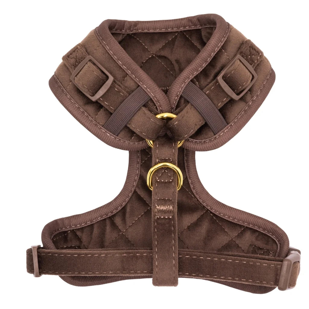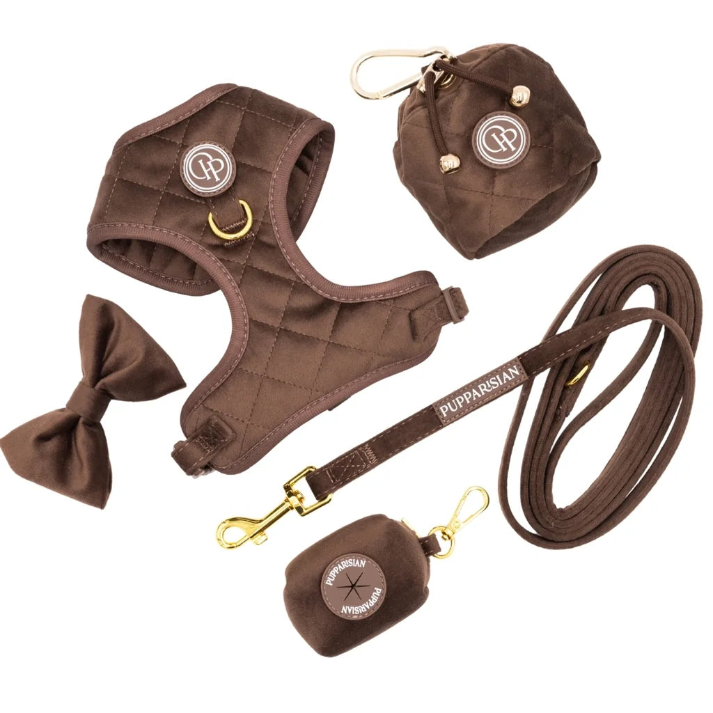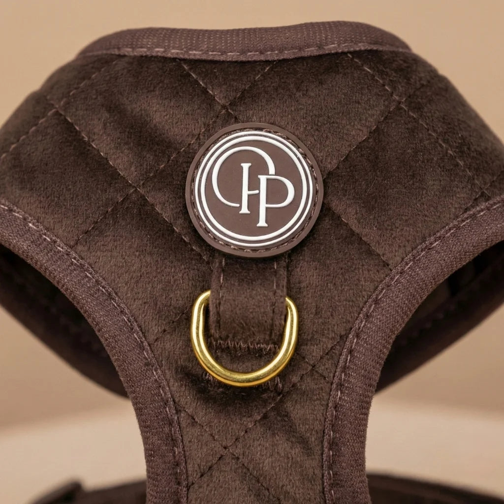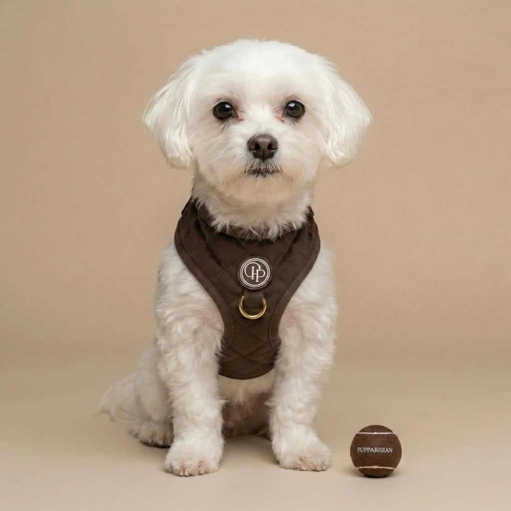 Szelki bezuciskowe Pupparisian w kolorze czekoladowego brązu to gwarancja maksymalnego komfortu podczas każdego spaceru. Wykonane z miękkiego, pikowanego weluru premium, idealnie przylegają do ciała psa, nie powodując otarć ani wycierania sierści.