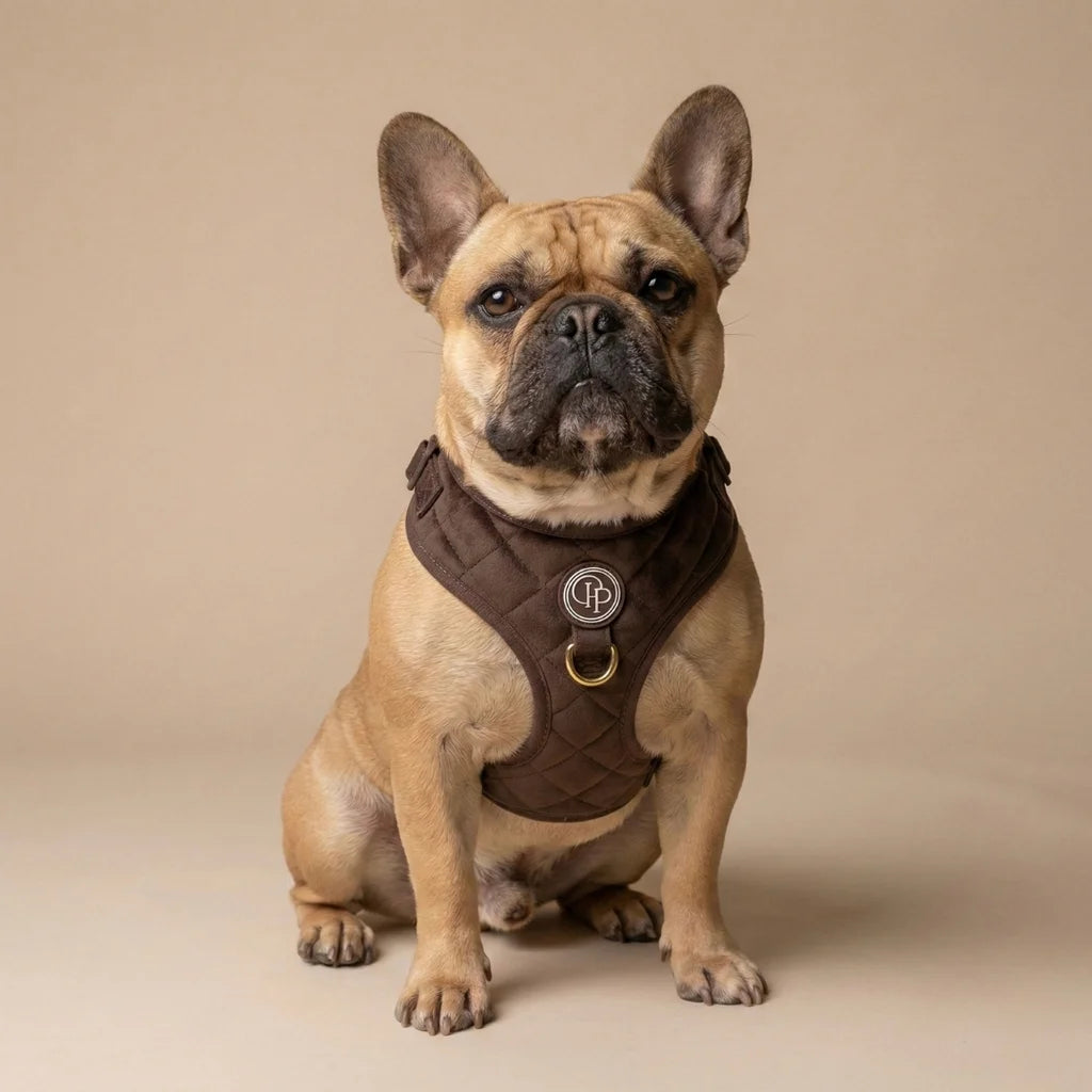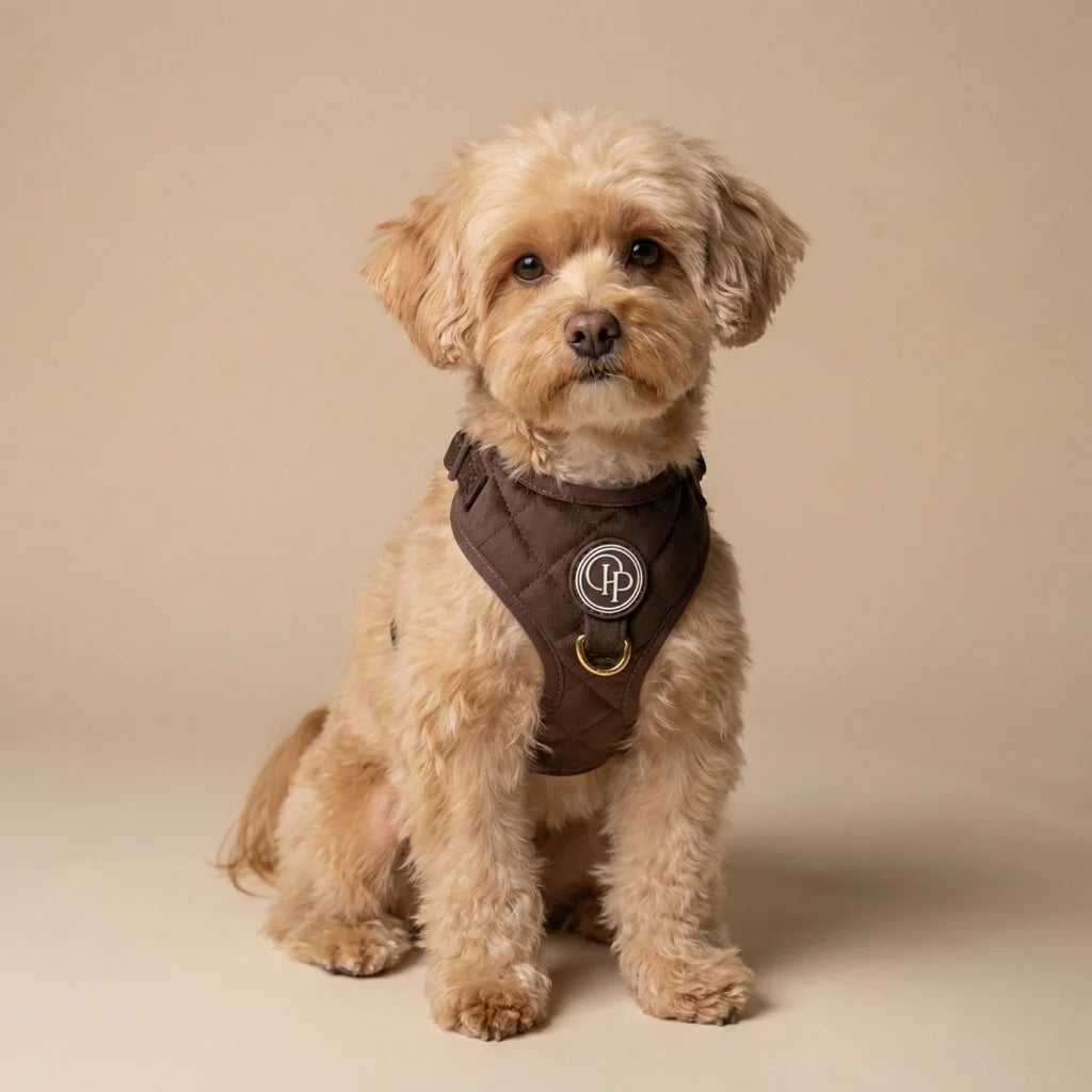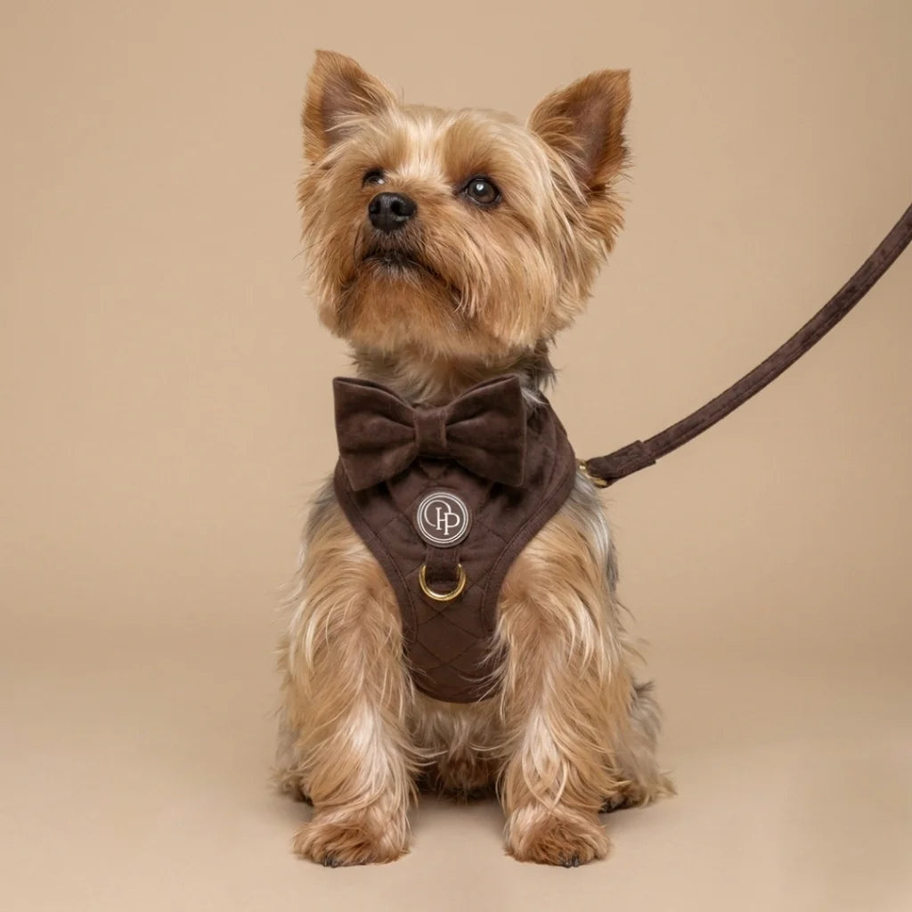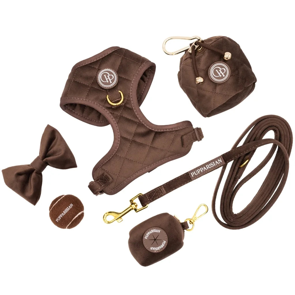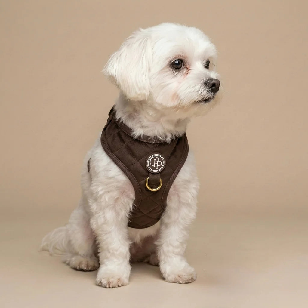 Szelki bezuciskowe Pupparisian w kolorze czekoladowego brązu to gwarancja maksymalnego komfortu podczas każdego spaceru. Wykonane z miękkiego, pikowanego weluru premium, idealnie przylegają do ciała psa, nie powodując otarć ani wycierania sierści.