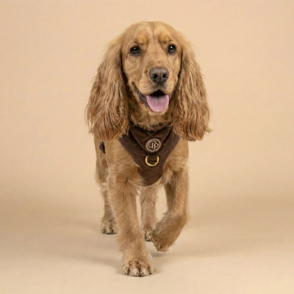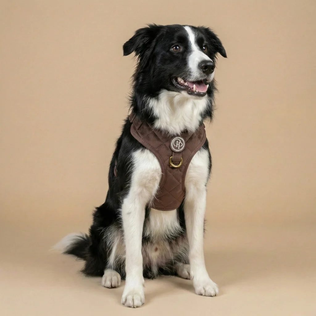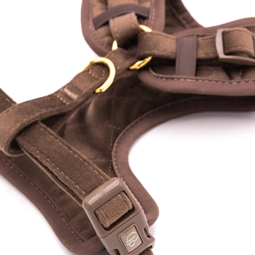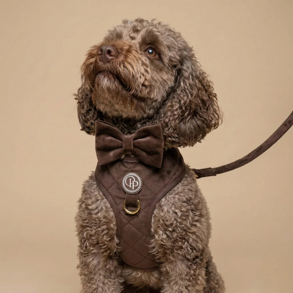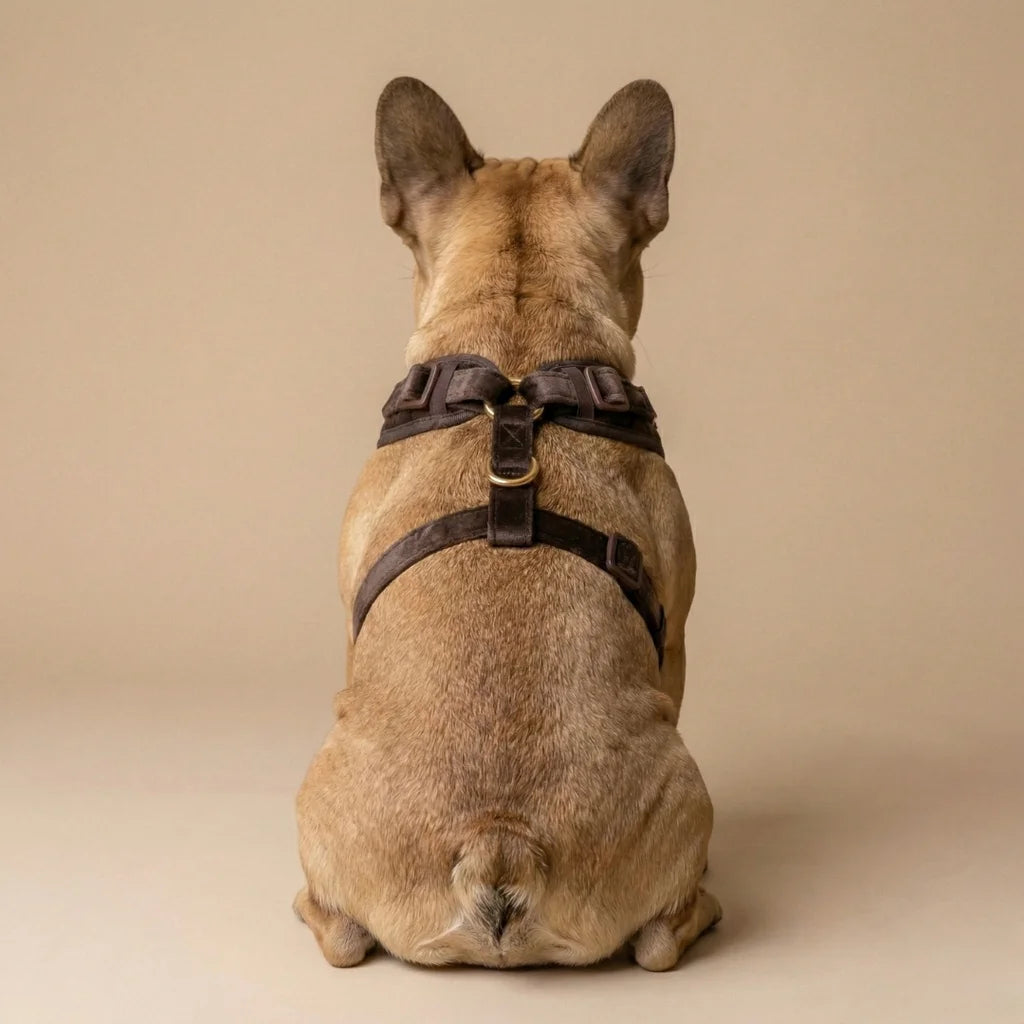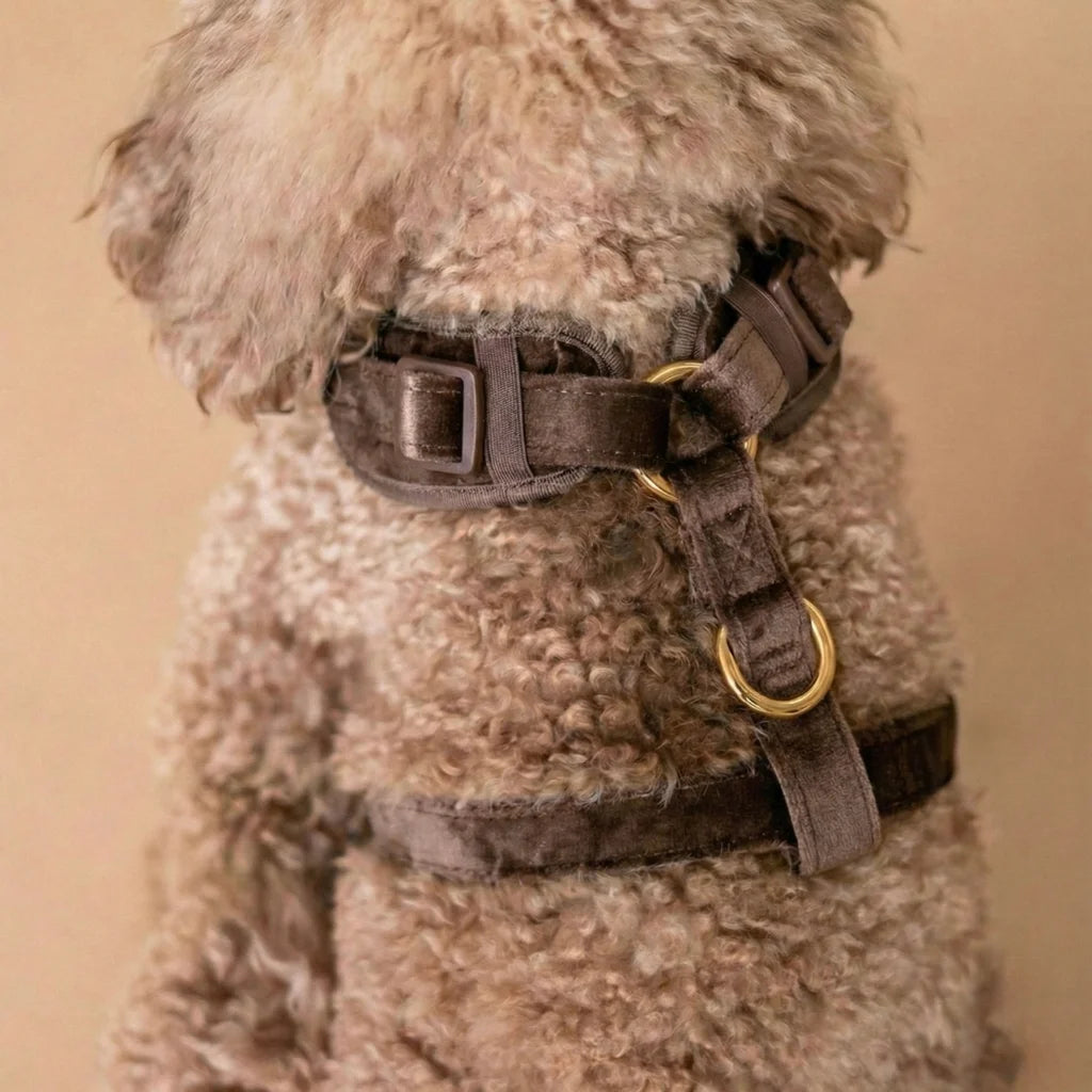 Szelki bezuciskowe Pupparisian w kolorze czekoladowego brązu to gwarancja maksymalnego komfortu podczas każdego spaceru. Wykonane z miękkiego, pikowanego weluru premium, idealnie przylegają do ciała psa, nie powodując otarć ani wycierania sierści.